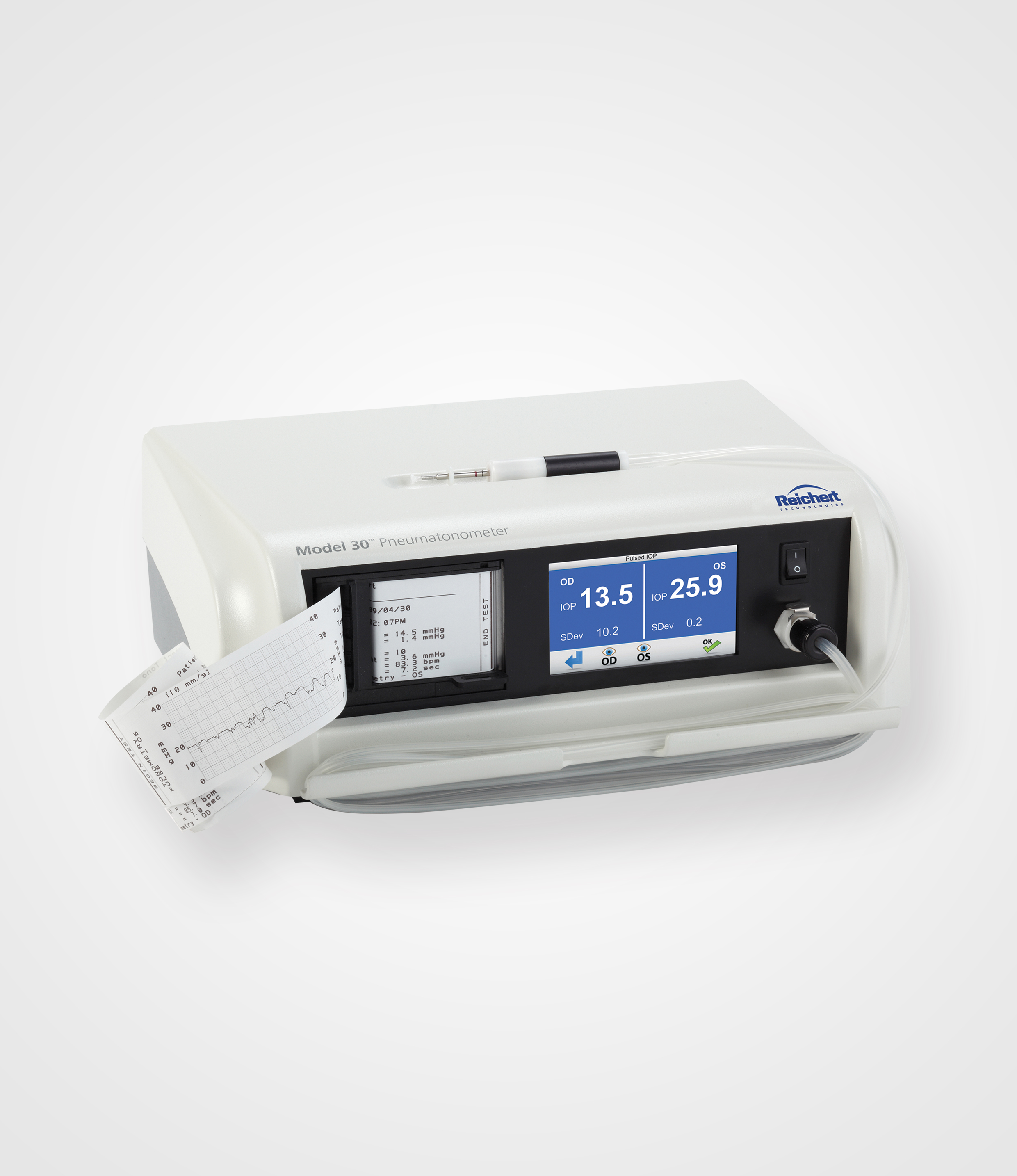 MODEL 30, kolay kulanımı ile hızlı ve hassas tonometre ve tonografi sonuçları vermektedir. Pinemotik 5 mm’ lik yumuşak silikon temas alanı ile, Model 30 Pneumatonometer gerçek zamanlı olarak intra oküler basıncı ve dalga boyutunu verir.