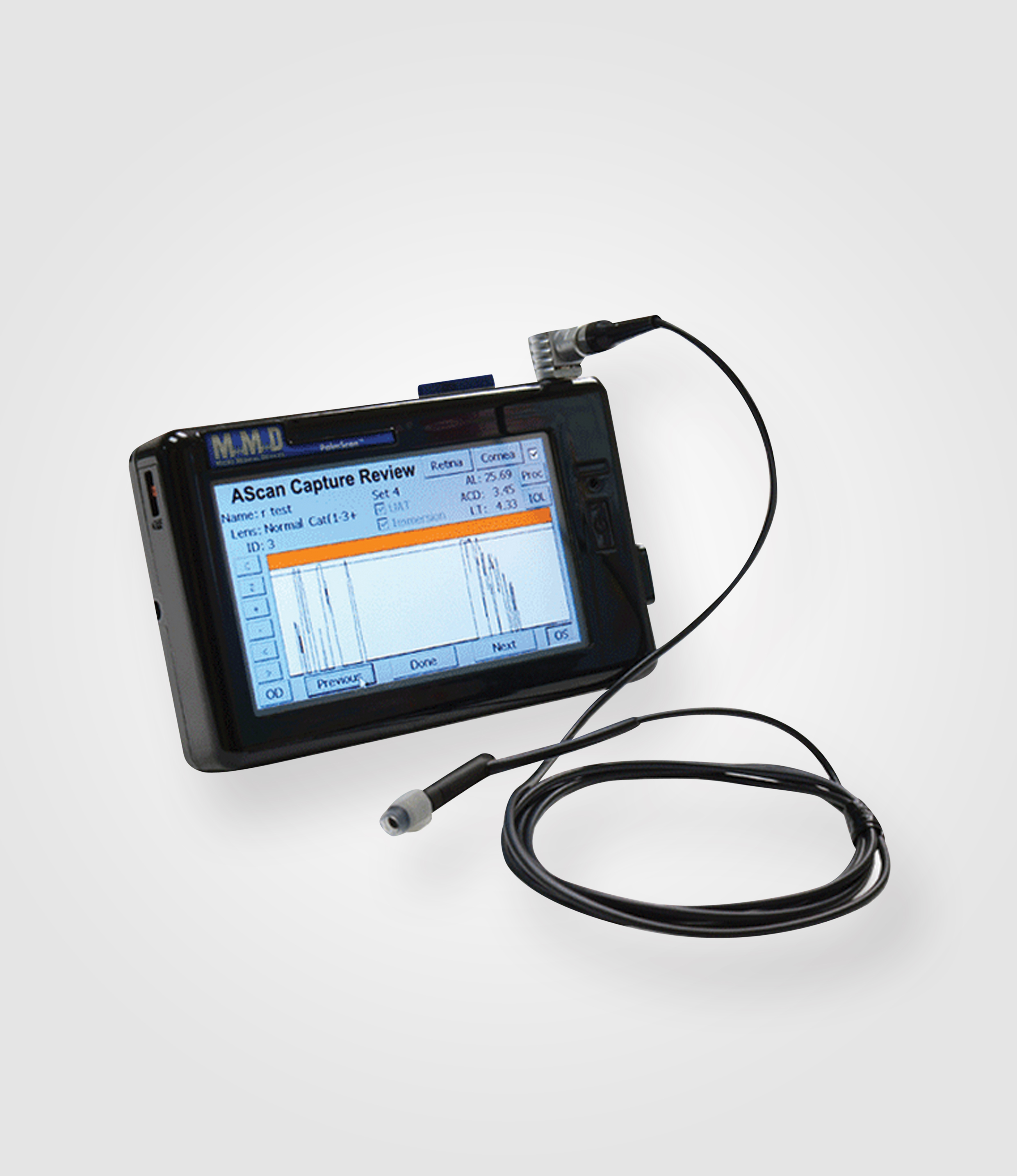 * PalmScan'in 264 MHz Örnekleme frekansı Kullanıcı tarafından konfigüre edilebilen eşitliklerle korneal kalınlık için kolaylıkla